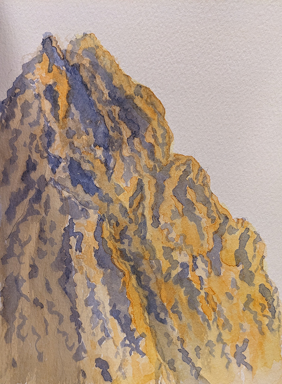 In this study I first laid down the dark areas then, after some drying time, came back with the lighter colors of sunshine. In hindsight I learned that it would be better with this medium to first put down the light colors then use the dark color to define the shapes of the rocks and valleys. I’ll try this method next time.